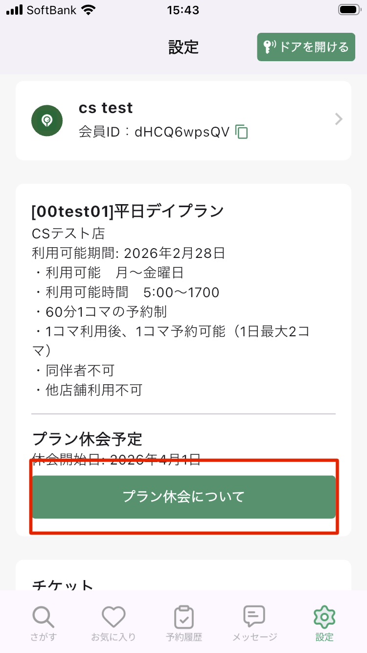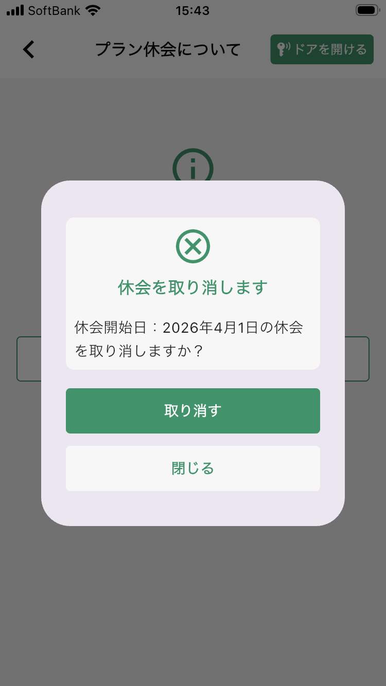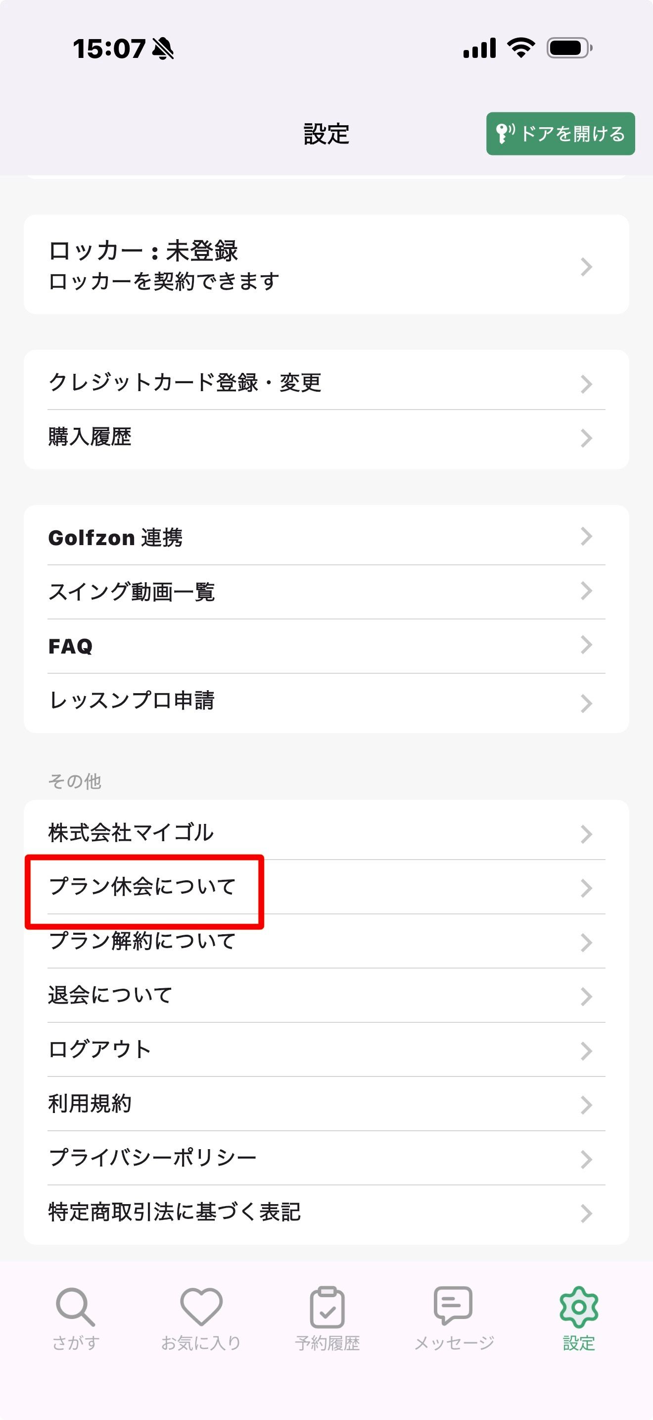 1. マイゴルアプリを開き、「設定」をタップ2. 下にスクロールし、「プラン休会について」をタップ3. 休会理由を選択し、「休会する」のボタンをタップ4. 内容を確認し、休会するのボタンをタップ※休会の取り消し「プラン休会について」をタップ「休会処理を取り消す」をタップ「取り消す」をタップ